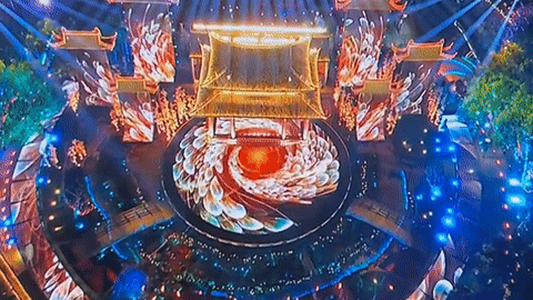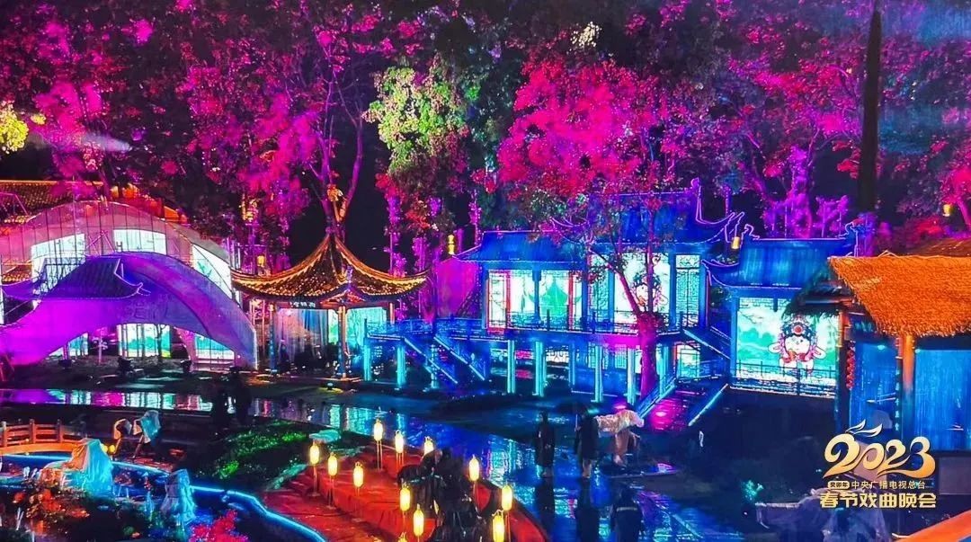 借鉴于宋代传统建筑风格的12座戏台屋顶与浮雕戏台,形成百座戏台汇聚之感,营造出“戏曲之城”的概念。宛如戏服“水袖”的飘带将主舞台环抱其中,灵动隽永,搭配透明奇幻的视觉效果,充分体现了总台“思想+艺术+技术”融合传播的鲜明特色。